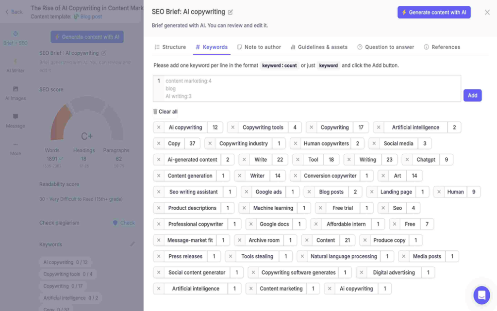 In addition to that, there is an in-line AI writer with various options for improving content.